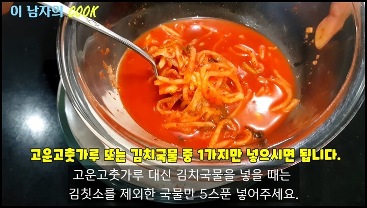 만약 김치가 너무 신김치이거나 묵은지라면 김치국물을 넣는 것보다 고운 고춧가루를 사용하는 것이 더 좋습니다.
