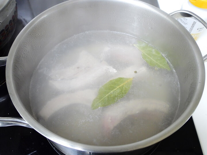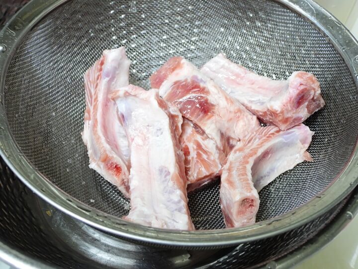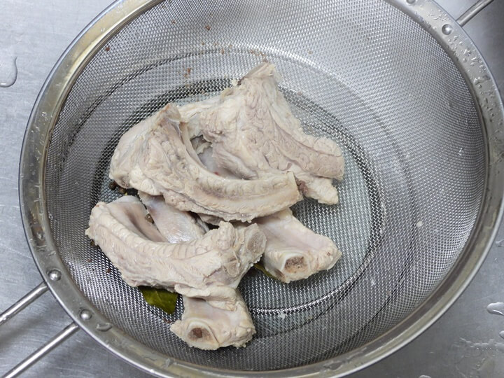 월계수 잎 2~3장 넣고, 통후추도 몇 알 넣어서 초벌로 삶아줍니다. 삶아낸 등갈비는 물에 한번 씻어줍니다. 삶는 동안 붙어버린 불순물 찌꺼기들을 깨끗이 씻어주세요.
