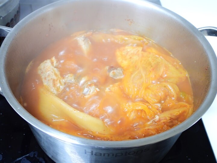 데쳐서 씻어둔 등갈비도 같이 넣어주고, 그대로 푹푹 끓여줍니다. 김치가 푹 익어야 맛있으니 김치가 푹 익도록 계속 끓여주어요. 중간에 물이 졸아들어 부족하면 쌀뜨물을 보충해 주어요.