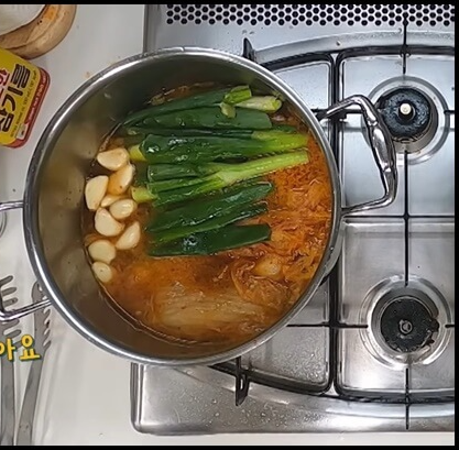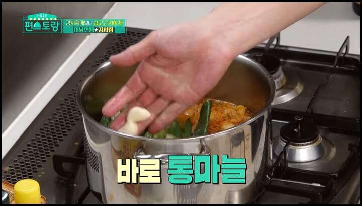 김치찌개나 김치찜은 마지막에 넣는 마늘이 맛을 좌우하는데, 마지막으로 다진마늘 1T를 추가해서 넣어줍니다. 마늘은 마지막에 넣어야 마늘 향이 살아 있습니다.