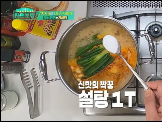 그리고 신맛이 많이 나는 묵은지이기 때문에 신 맛과 단 맛을 함께 상승시켜줄 설탕을 1T 넣어 줍니다. 신김치와 설탕은 찰떡궁합인데, 묵은지만 넣고 끓이면 시큼한 맛이 나지만 설탕을 넣어 주면 새콤한 맛으로 바뀝니다.