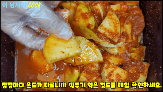 베란다의 온도에 따라 깍두기가 익는 정도가 달라질 수 있으니 매일 확인하셔서 익는 정도를 살펴서 냉장고에 넣어 보관합니다.