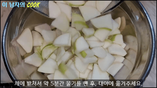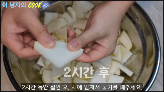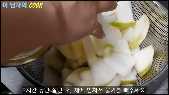 총 2시간을 다 절인 후 무를 체에 밭쳐서 물기를 빼 줍니다. 5분 정도 그대로 두어 물기를 잘 빼 줍니다.