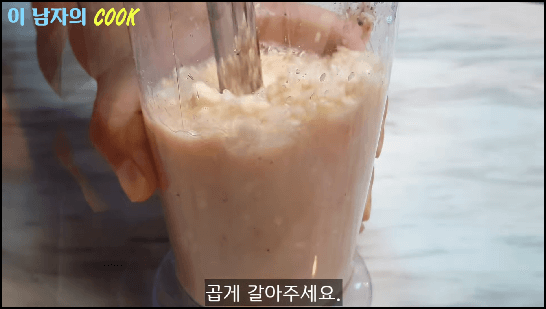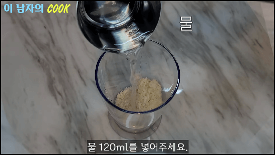 무가 절여지는 동안 양념을 만들어 줍니다. 찬밥 반공기 분량(120g)을 믹서기에 넣어주고, 물 120ml, 마늘 60g을 넣어줍니다. 마늘은 다진마늘을 사용할 경우엔 3스푼 정도 넣으면 됩니다. 생강 20g, 새우젓 2스푼을 넣어서 곱게 갈아줍니다.