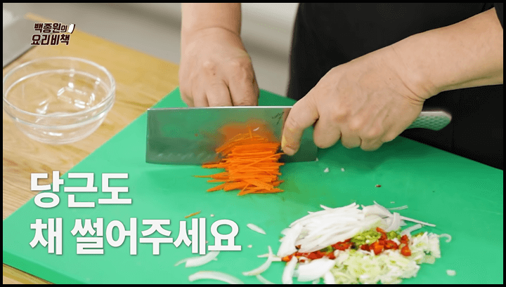 4) 양파와 당근도 가늘게 채 썰어줍니다. 얇게 채 썰어야 깻잎김치에서 도드라지지 않고 함게 먹기가 좋습니다.