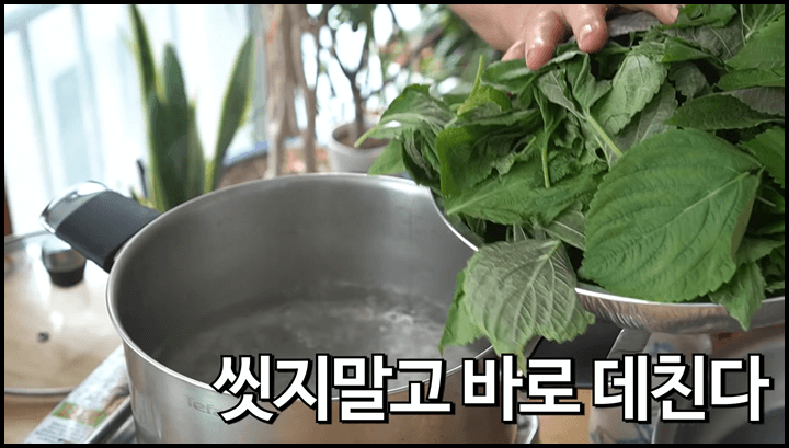 3) 깻잎순은 씻지말고 바로 데쳐주는데, 물이 끓으면 바로 넣어줍니다.
