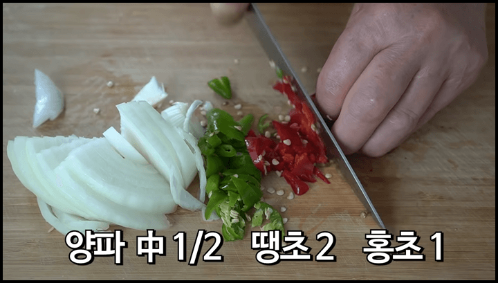 2) 양파 반개, 청양고추, 홍고추를 썰어서 넣어줍니다.