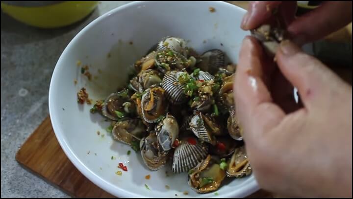 껍질 깐 꼬막에 물이 생겼다면 쭉 따라서 버리고 양념장을 모두 부어줍니다. 그리고 손으로 살살 섞어가면서 고루고루 잘 ㅁ무쳐줍니다.