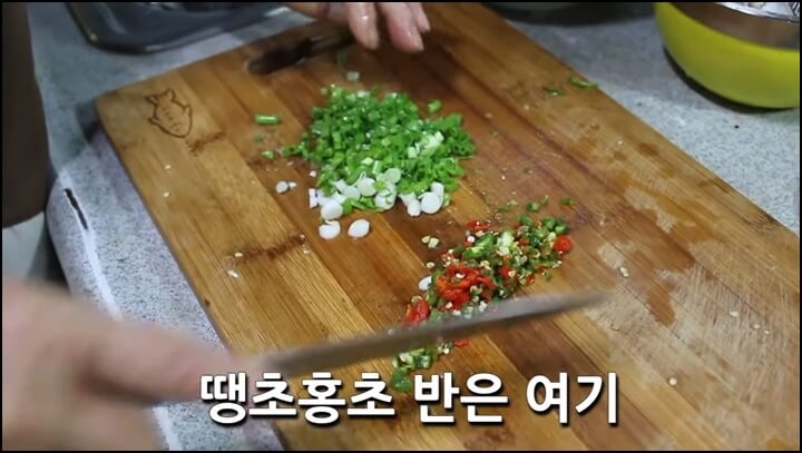 청양고추와 홍고추를 잘게 다져주고, 잔파도 잘게 다져줍니다. 고추 다진 것과 파 다진 것의 반은 꼬막장, 꼬막 삶은 물에 넣어주고, 마늘 반 스푼 정도도 같이 넣어줍니다.