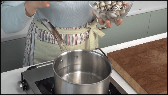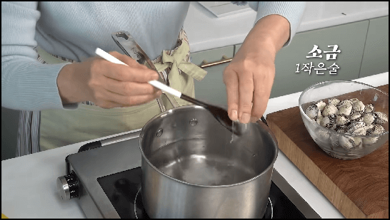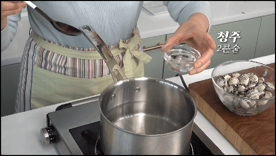 먼저 물이 바글바글 끓으려고 할 때 청주 2큰술, 소금 1작은술을 넣어줍니다. 해감을 했지만 소금물에 데쳐야 깨끗하게 살균효과도 있으니 소금 1작은술을 넣어서 삶아줍니다.