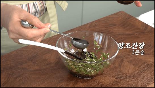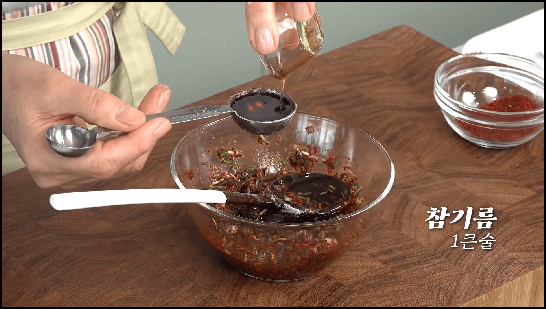 그런 다음 매실청 1큰술, 참기름 1큰술, 조청 2큰술, 깨소금 1큰술을 넣어서 잘 섞어줍니다. 단 것이 싫으면 조청 양을 줄이면 되고, 입맛에 맞게 맛을 조절하시면 됩니다.