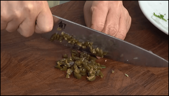 이제 꼬막무침 양념장을 만들어 봅시다. 꼬막무침 양념장에 달래를 넣어서 만들면 향도 좋고 맛도 더 풍성해집니다. 만약 달래가 없다면 실파나 쪽파를 사용해도 좋습니다. 달래는 뿌리 부분을 톡톡 두드려 준 후 송송 썰어줍니다. 고추장아찌 고추 2개도 쫑쫑 다져주는데, 청양고추나 일반고추를 사용해도 좋습니다.