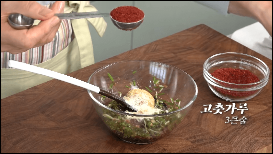 달래와 고추를 그릇에 담은 후 여기에 간장 3큰술, 다진마늘 1큰술, 원당 1큰술, 고춧가루 3큰술을 넣어줍니다. 일반 숟가락으로 넣으실 때는 수북하게 담아주세요. 골고루 잘 섞어주는데 많이 뻑뻑한 상태입니다. 그러니 여기에 물 2큰술을 넣어서 잘 섞어줍니다.