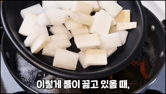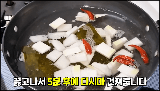 냄비에 물 1.25리터를 넣고, 건다시마 1조각과 베트남고추 5개를 넣고 끓여줍니다. 물이 끓으면 무 썰어둔 것을 모두 넣고 같이 끓이는데, 5분이 지난 뒤에는 다시마를 건져내고, 10분이 지나서는 베트남 고추를 건져냅니다.