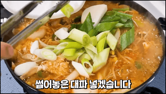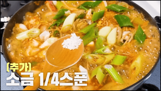 5분 후에 대파를 넣고, 맛을 봐서 간이 싱거우면 소금을 추가해서 간을 맞춰줍니다. 마지막으로 쑥갓과 팽이버섯을 올려주면 꽃게탕 완성입니다.