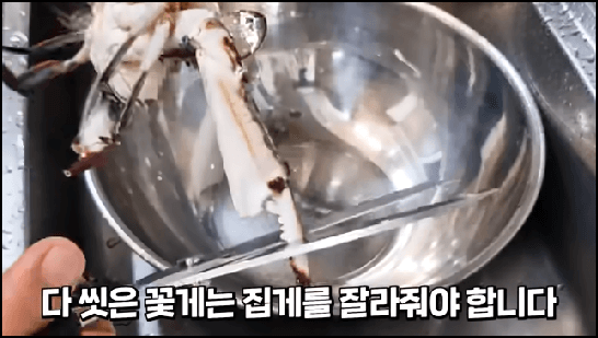 아가미에서 비린내가 많이 나기 때문에 아가미는 다 떼서 제거해 줍니다. 입도 가위로 잘라줍니다. 아가미 떼낸 부위를 솔로 살짝 씻어주고, 몸통을 반으로 잘라줍니다. 게가 크다면 한번 더 잘라주는데 가위로 반 정도 칼집을 낸 후 손으로 갈라주면 살이 삐져 나오지 않고 깔끔하게 잘라집니다.