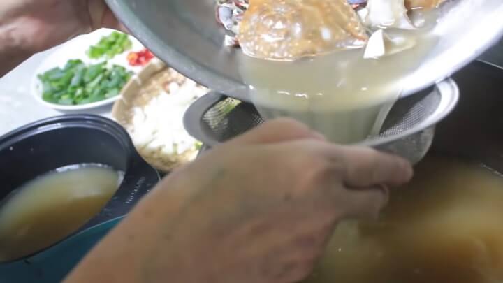 게딱지와 다리 잘라낸 것들에 육수 3~4 국자를 떠서 휘휘 저어주면 게딱지에서 다싯물이 우러납니다. 우려낸 게딱지 육수도 체에 걸러 같이 넣어줍니다.