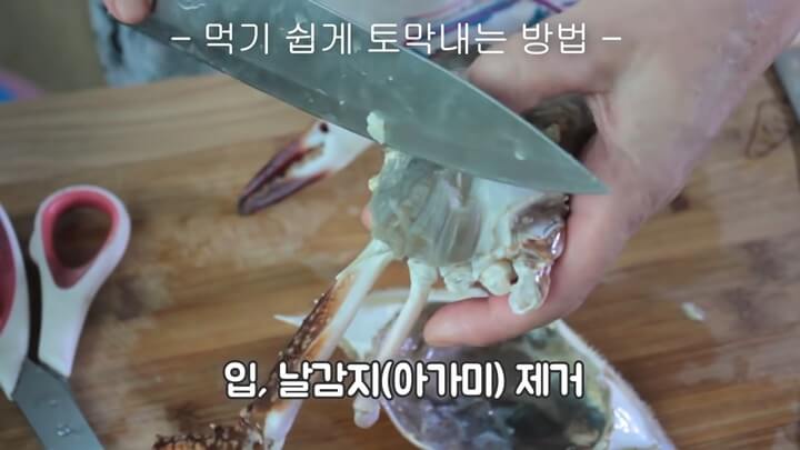 모래주머니를 제거해주고, 입과 아가미도 제거해 줍니다. 집게다리도 잘라주면 먹기가 편합니다.