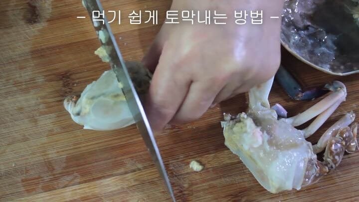 먹기 쉽게 게를 토막내는데, 눕힌 채로 자르지 말고 세로로 세워서 잘라줍니다. 그러면 살이 밀리지 않고 깔끔하게 잘라집니다.