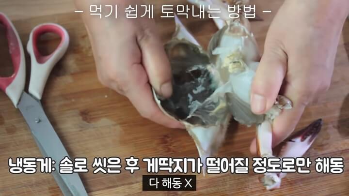 꽃게는 솔로 껍질을 깨끗하게 씻어줍니다. 냉동꽃게라면 완전히 해동시킬 필요없이 게딱지가 떨어질 정도로만 해동해 주면 됩니다.