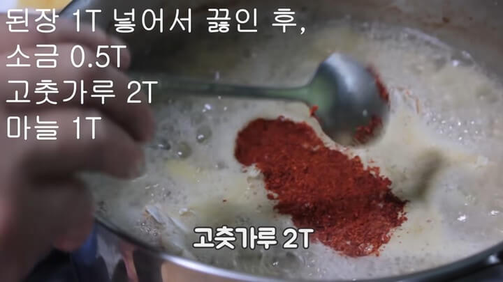한소끔 끓고 나면 소금 반숟갈, 고춧가루 2 숟갈을 넣어 매콤한 맛을 살리고 색도 내줍니다. 간 마늘 1 숟갈도 넣어줍니다.