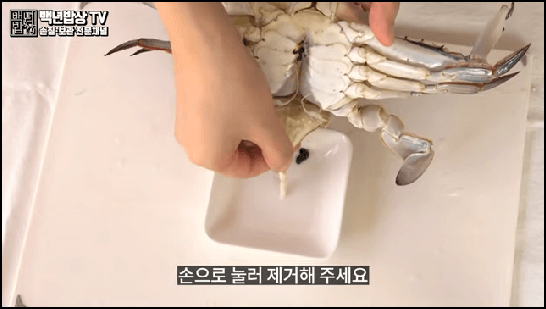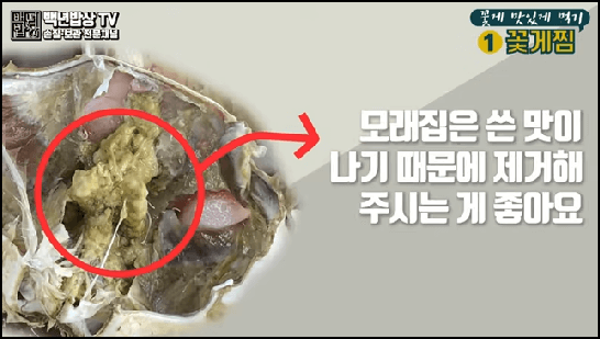 한 김 식힌 게는 배꼽을 완전히 젖혀 몸통과 게딱지 사이에 손을 넣고 벌려서 분리해 줍니다. 게 몸통에 붙은 아가미는 손이나 가위로 제거한 후 꽃게 내장 쪽 모래집을 제거하고 먹으면 됩니다.