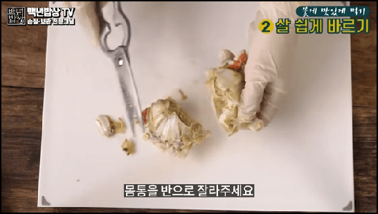 꽃게의 입을 자르고 몸을 반으로 자른 후 몸통의 배 부분을 가위로 잘라주고 다리 관절을 잡고 하나씩 떼어 먹으면 손쉽게 살만 발라서 먹을 수 있습니다.