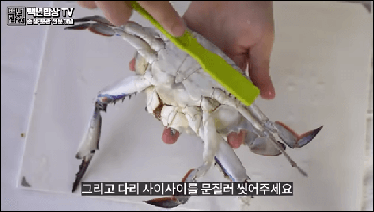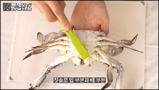 꽃게가 살아있다면 수돗물에 담가 기절 시킨 후 손질하면 되는데, 배 껍데기를 열어서 안쪽에 있는 똥을 손으로 눌러 제거해 줍니다. 그런 다음 칫솔로 입, 배, 다리 사이사이를 문질러서 씻어줍니다.