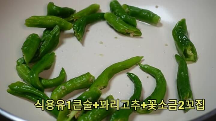 멸치를 볶았던 팬을 키친타올로 닦아준 후 식용유 1큰술 두르고 꽈리고추를 넣고, 꽃소금 2꼬집도 같이 넣어 볶아줍니다. 꽃소금을 넣으면 간도 배이고 꽈리고추의 색도 더욱 초록초록해져요.