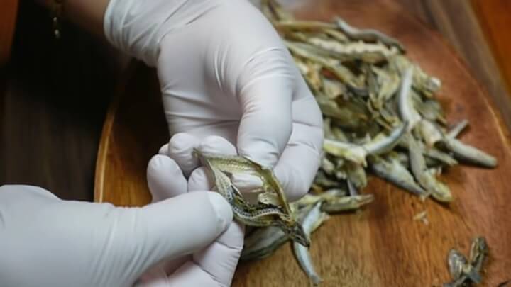 멸치를 손질해주는데, 반으로 갈라 내장과 가시, 대가리를 모두 제거해줍니다.