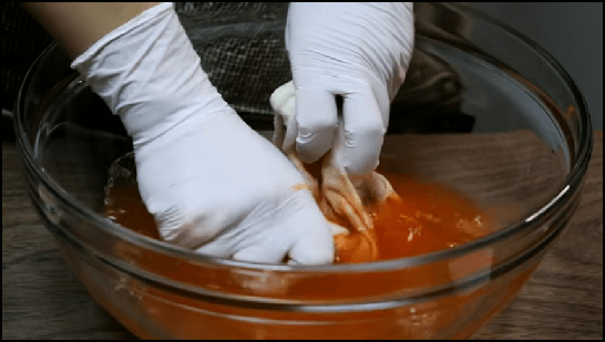 나박김치의 고추색 밑국물을 만들기 위해 그릇에 생수 5컵을 붓고, 베 보자기에 마늘 3큰술과 고춧가루 5큰술을 넣어줍니다. 베 보자기를 생수에 담근 채 손으로 조물조물하여 국물을 우려내 줍니다. 마늘과 고추가루 색이 충분히 우려내 주는데 나박김치에는 이렇게 국물을 우려내서 넣어주는 것이 훨씬 깔끔하고 맛있습니다.
