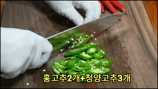 쪽파는 3~4cm 길이로 썰고, 홍고추와 청양고추는 어슷 썰어서 준비합니다.