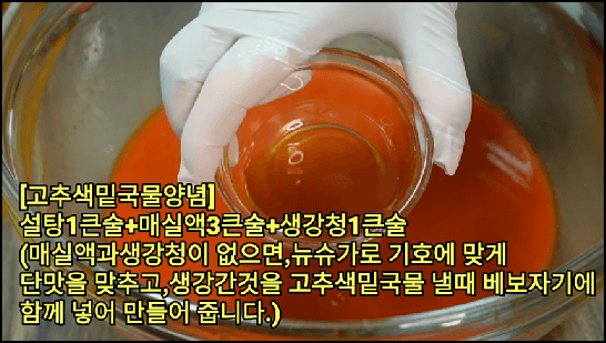 국물을 충분히 우려냈다면 단맛을 내 줄 매실액 3큰술과 설탕 1큰술을 넣고, 생강청도 1큰술 넣어줍니다. 만약 매실액이 없다면 뉴슈가를 넣어서 입맛에 맞게 단맛을 맞추면 되고, 생강청이 없을 경우엔 생강을 갈아서 고추색 밑국물을 낼 때 베보자기에 같이 넣고 우려내 주면 됩니다.