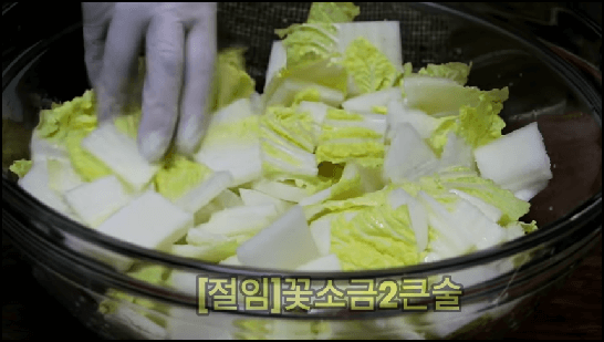 무는 2~3mm 두께로 나박나박 썰어주고, 알배기 배추는 잎 부분을 정리한 후 무와 비슷한 크기로 썰어줍니다. 무와 배추에 꽃소금 2큰술을 넣어 골고루 버무려서 30분간 절여줍니다.