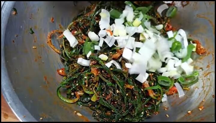 냉이가 약간 거친 편이기 때문에 손으로 바락바락 힘을 줘가며 무쳐줍니다. 무친 후 간을 한번 봅니다. 맛있으면 그대로 파 썰어둔 것을 넣고 마저 무쳐줍니다.