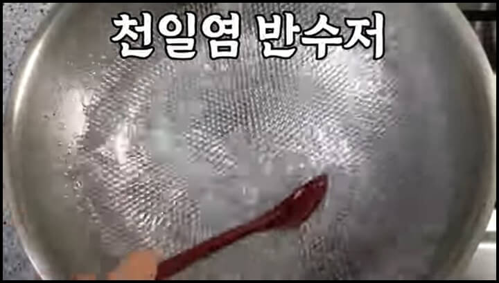 냉이가 잠길 정도의 물을 냄비에 부어줍니다. 1리터 정도 넣어주고요, 물이 끓으면 천일염 반 수저를 넣어서 녹여줍니다. 소금을 넣어주면 나물의 색이 초록초록 더 선명하고 이쁩니다.