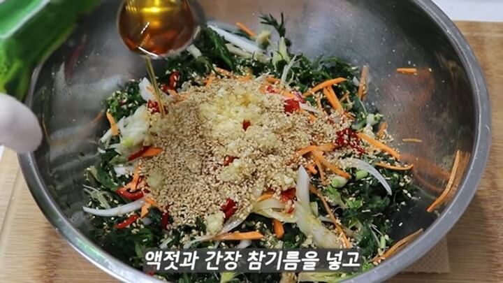 마늘 1큰술, 통깨, 깨소금을 넣어주고, 액젓 1큰술, 진간장 2큰술, 참기름 2큰술 넣고 조물조물 바락바락 무쳐 주세요.