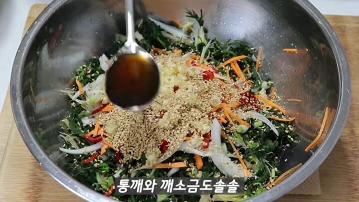 참기름 1 숟갈, 깨소금 넣고 버무려주고, 통깨보다 깨소금을 넣는 것이 더 고소하고 맛있어요.