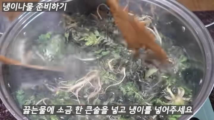 끓는 물에 소금 한 큰술을 넣고 냉이를 넣어주세요.