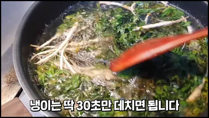 끓는 물에 천일염 1스푼을 넣고 냉이를 넣고 데쳐줍니다. 냉이는 딱 30초만 데치면 됩니다. 너무 오래 데치면 다 물러지니 30초만 데친 후 찬물에 담가서 씻어줍니다.