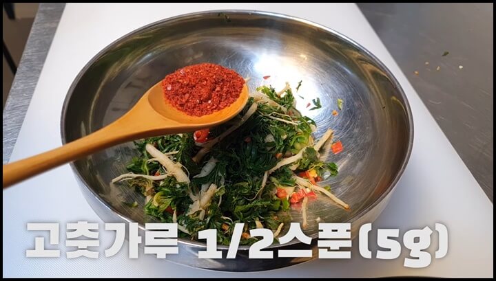 고춧가루 1/2스푼, 간 마늘 1/4스푼을 넣어줍니다. 냉이무침에는 간 마늘을 조금만 넣어야 합니다. 간 마늘을 많이 넣으면 쓴맛이 나기 때문에 최대한 적게 넣는 것이 좋습니다.