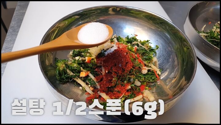 손으로 조물조물 골고루 무쳐줍니다. 서울식은 고추장, 설탕만 넣고 무쳐도 맛있습니다.