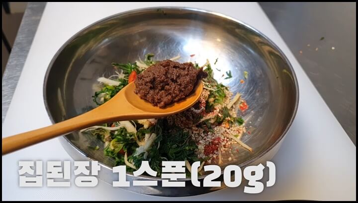 냉이고추장무침에 들어갔던 식초만 빠지고, 고추장 대신 된장을 넣으면 됩니다. 다른 재료는 모두 같습니다.