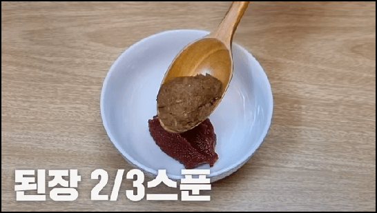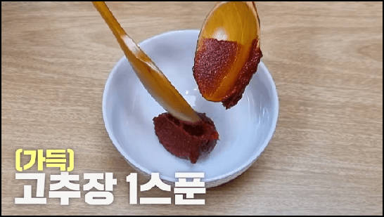 이제 양념장을 만들어봅시다. 고추장 수북하게 1스푼 넣고, 된장 2/3스푼을 넣어줍니다. 된장은 노각무침 황금레시피의 포인트입니다. 된장이 들어가면 입맛이 확 당기면서 아주 맛있어집니다.