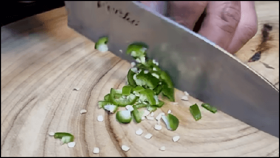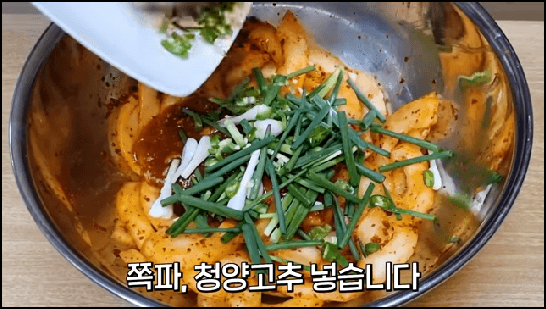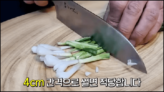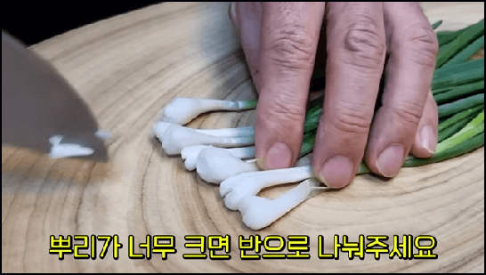 쪽파 7가닥은 4cm 정도의 길이로 잘라줍니다. 뿌리 쪽이 두꺼우면 칼집을 내서 잘라주면 됩니다. 청양고추 1개는 십자로 칼집을 내서 잘게 쫑쫑 썰어줍니다.