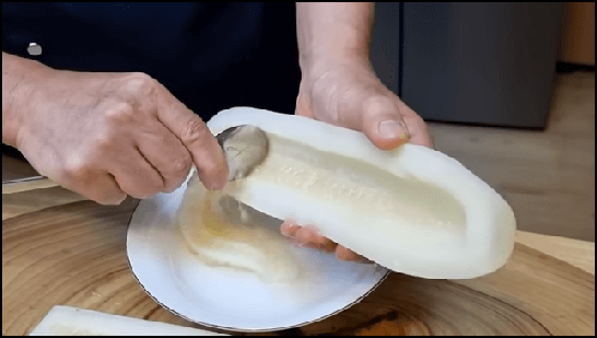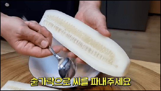 노각 1개(950g)는 양 끝을 잘라준 후 필러로 껍질을 벗겨줍니다. 그런 다음 반으로 갈라서 씨를 빼 긁어냅니다. 숟가락으로 살 긁어내면 쉽게 제거할 수 있습니다. 노각은 5mm 정도의 두께로 어슷 썰어줍니다.