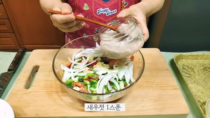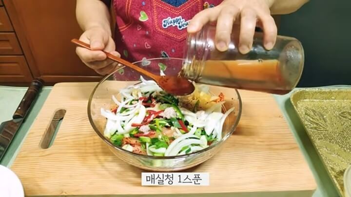 그런 다음 부재료로 썰어두었던 양파와 파, 고추를 모두 넣어줍니다. 다진 마늘 1스푼, 멸치액젓 2스푼, 새우젓 1스푼, 매실청 1스푼, 설탕 1스푼, 들기름 1스푼을 넣고 조물조물 무쳐주세요.
