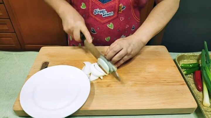 노각이 절여지는 동안 양파 1/4개를 채 썰어줍니다. 대파 가는 것으로 1개 쫑쫑 썰어주세요.