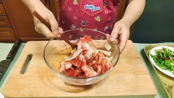 물기를 꼭 짠 노각을 그릇에 담고 고춧가루 2스푼을 넣고 골고루 무쳐줍니다. 먼저 이렇게 고춧가루로 무쳐서 고춧가루가 물기를 머금도록 해 주세요.