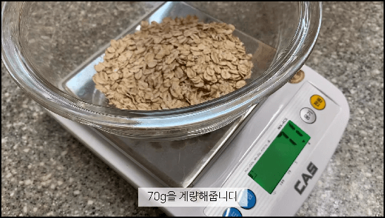 먼저 저울을 준비해서 그래놀라에 들어갈 재료를 계량해 줍니다. 오트밀 70g을 계량하고, 견과류도 50g 계량해서 준비합니다. 견과류는 좋아하는 것으로 넣으면 되고, 아몬드나 피칸 등 통째로 넣어도 되고 작게 잘라서 넣어도 됩니다. 좋아하는 취향껏 통으로 또는 잘게 잘라서 넣으세요.